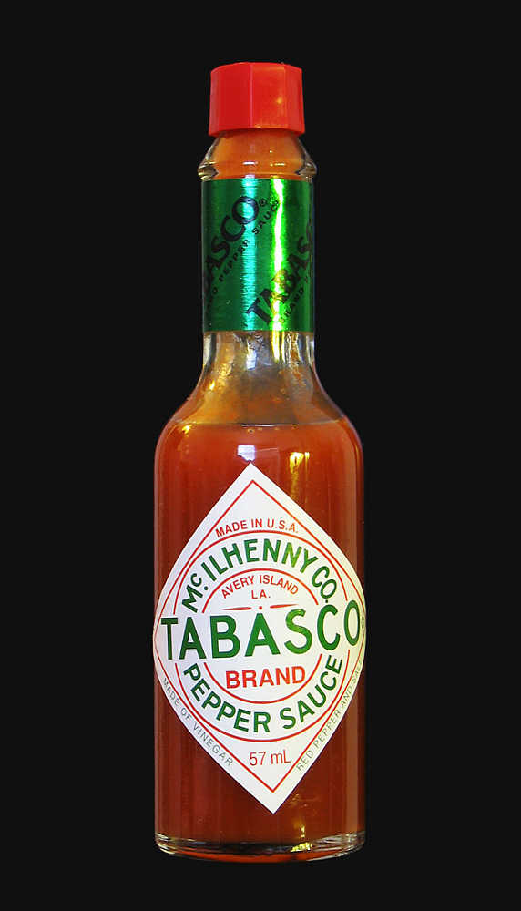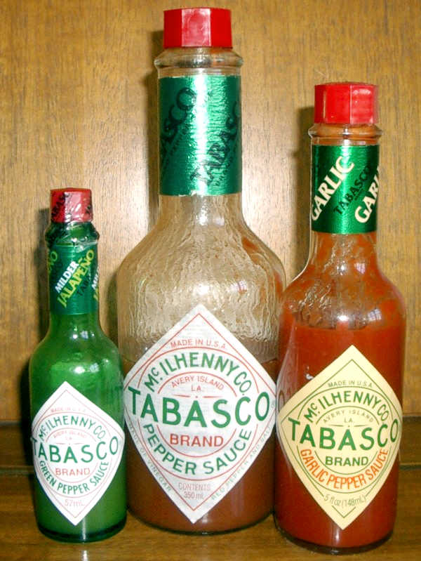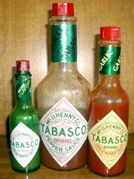 Tabasco Pepper Sauce: Die Tabasco Pepper Sauce ist das Hauptprodukt der Tabasco-Produktlinie und wird noch heute nach dem Originalrezept von 1868 hergestellt. Als Zutaten werden ausschließlich die reifen Früchte der Chilisorte 'Tabasco', Essig und auf Avery Island gewonnenes Salz verwendet. Die Schärfe wird mit 2500 bis 5000 SCU angegeben. Als eine der bekanntesten Chilisaucen findet sie nicht nur fast weltweit in den Küchen Einsatz, sie ist auch Bestandteil einiger Cocktails. Das bekannteste alkoholische Getränk, für das Tabascosauce verwendet wird, ist die Bloody Mary, in Deutschland auch der Rostige Nagel.